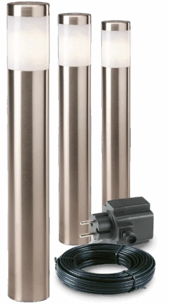 Set bestaande uit drie staande lampen, een hoofdkabel van acht meter en een 21W transformator. De lamp heeft een cilinder met maar liefst 24 leds en een verbruik van 2 watt. De Albus set bestaat uit drie lampen, een hoofdkabel en een transformator. Een strak vormgegeven lamp, gemaakt van rvs en kunststof. De Albus is een prachtige, moderne staande lamp met een afmeting van 410 x 60 mm (hxb). De 12 volt verlichting is koppelbaar met andere Garden Lights lampen en heeft een cilinder met maar liefst 24 leds! Warm wit licht en een 2 meter lange kabel.