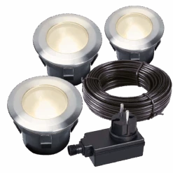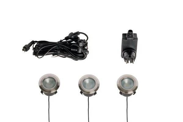 Complete set bestaande uit drie lampen, een 12W transformator en een acht meter hoofdkabel. De Larch set bevat drie grondspots die op een prachtige manier je tuinpad, terras of vlonder verlichten. Plaats je meerdere decklights naast elkaar, dan zul je zien dat dit een heel mooi effect geeft. Een echt sterrenpad! Warm wit licht en een kabel van 9 meter.