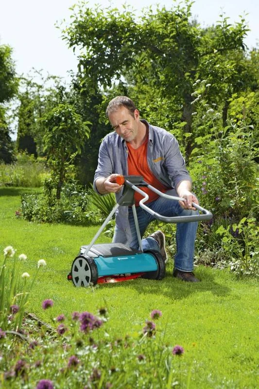 De GARDENA kooimesmaaier 400C is milieuvriendelijk en werkt zonder elektriciteit. De maaier is fluisterstil en gemakkelijk te duwen, doordat de messenkooi en het ondermes elkaar niet raken. De geharde messenkooi (van kwaliteitsstaal met antikleefcoating) en het geslepen ondermes garanderen een zuivere en precieze snede voor een uitstekend onderhouden gazon.