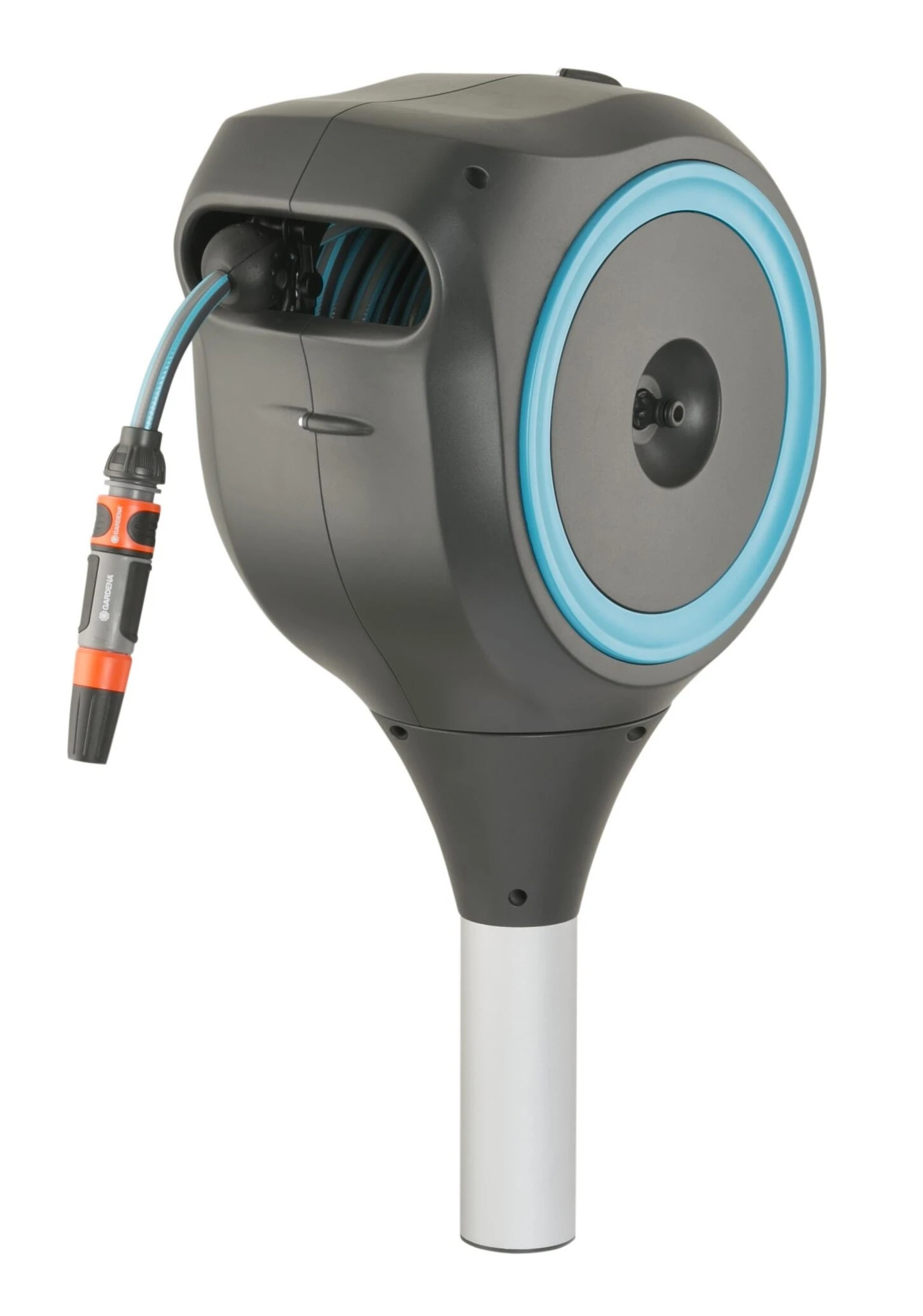 De slangenhouder en de bodempen worden eenvoudig met elkaar verbonden, waardoor de box een draaicirkel van 360 graden heeft. Zo heb je alle bewegingsvrijheid tijdens het sproeien. Dankzij deze flexibiliteit is iedere hoek van de tuin makkelijk bereikbaar zonder dat de slang in de knoop raakt. Als je na het sproeien zachtjes aan de slang trekt, rolt hij automatisch weer op. De geïntegreerde slanggeleider en de RollControl-technologie zorgen ervoor dat de slang veilig en geleidelijk wordt opgerold, zonder dat de slang knikt of in de knoop komt. De box is gemaakt van hoogwaardige materialen en is daardoor bestand tegen strenge weersomstandigheden en UV straling. Zo kan de box het hele jaar door gebruikt worden.