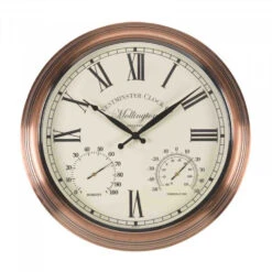 Deze 3 in 1 klok geeft niet alleen de tijd, maar ook de huidige luchtvochtigheid en temperatuur in graden Celsius en Fahrenheit weer. Geschikt voor binnen en buiten. De koperkleurige afwerking geeft de klok een traditionele uitstraling.